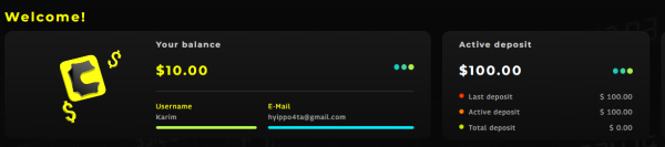Срок работы депозита: до 250% начислений Минимальный депозит: 50$ Максимальный депозит: Без ограничений Процентная ставка: Плавающие, более 1% в сутки В месяц: От 33% Чистый доход: +150%