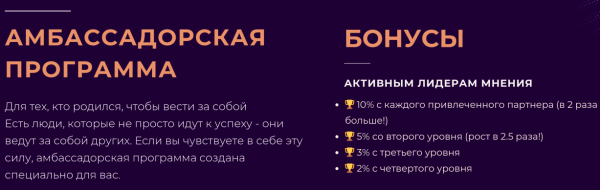 Также имеется амбассадорская программа, позволяющая активировать повышенное вознаграждение.