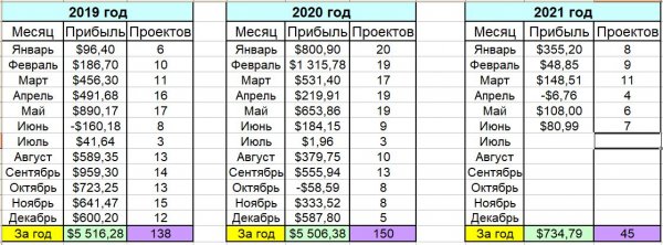 Я буду вести отчётность по всем проектам (за исключением проектов со статусом Под страховкой) и буду открыто показывать сколько проект проработал, сколько можно было заработать или же потерять.